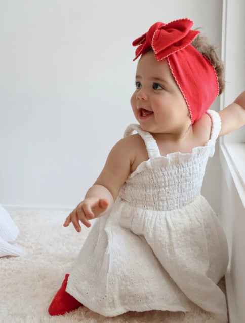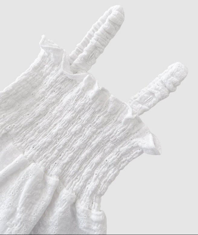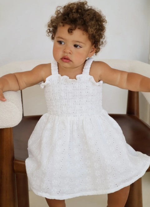 Cotton dress in our Laurel broderie anglaise fabric. Shirred bodice with adjustable button hole straps. Mix and match with items from our Christmas Collection.