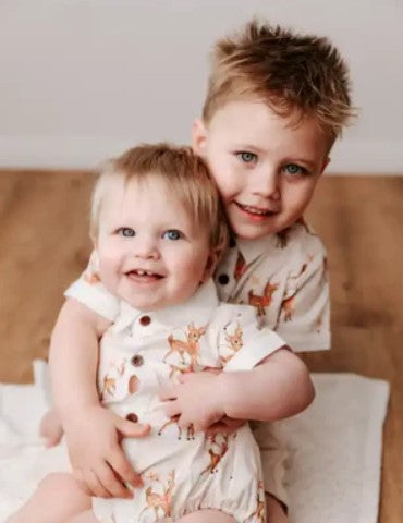 A cotton collared button up Romper/Shirt with the "Prancer" print all over.