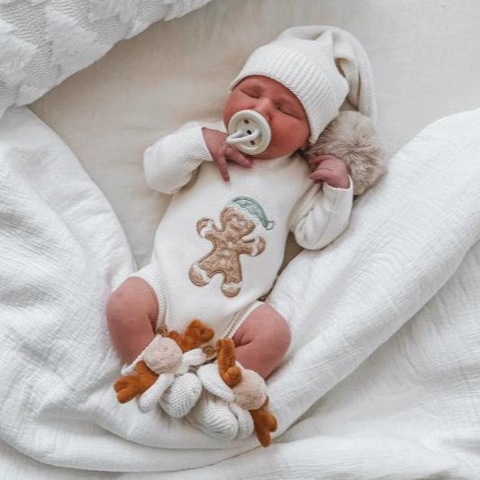 Indigo Dreams Christmas knit rompers are buttery soft, and made from 100% cotton featuring beautiful timber button details and sherpa embroidery on the front.