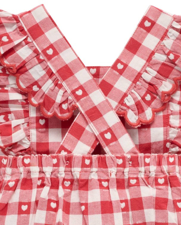 Featuring a sweet ruffle detail at the shoulders and an all over gingham pattern with little hearts. Designed with adjustable cross over straps, with gathers around the waist and legs for a comfy fit. Made from organic cotton linen blend for a soft and breathable outfit.