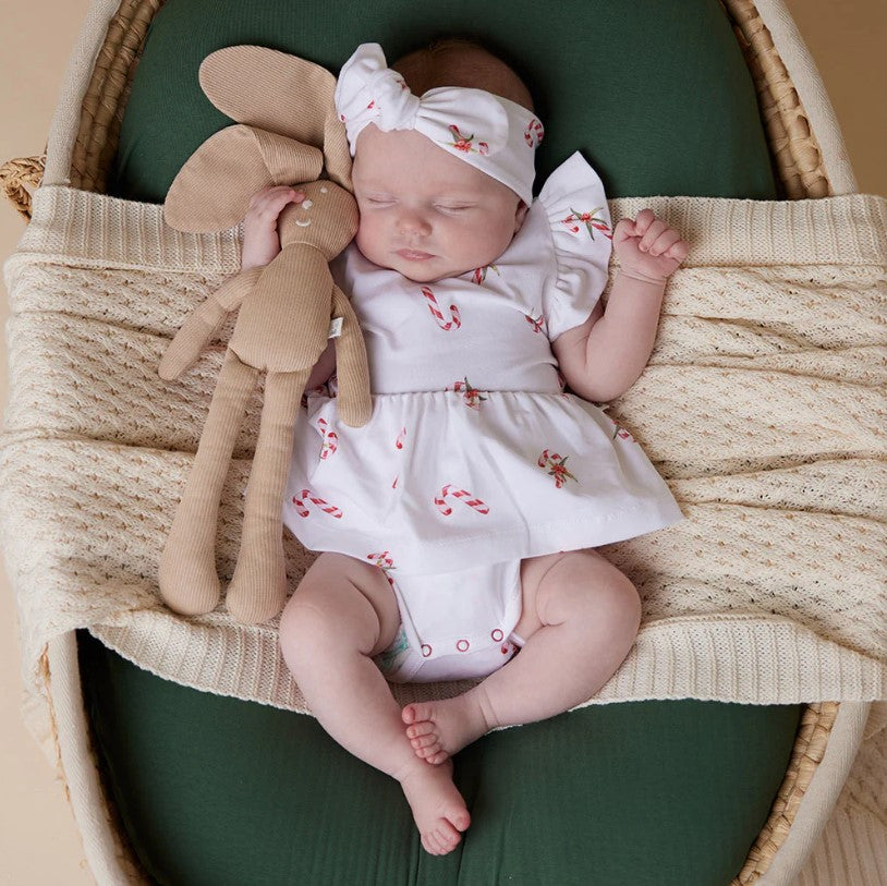 Soft and stretchy, Snuggle Hunny dresses are easy-care and very comfy for bub. The sizes up to and including size 1 come with a snap underbody to go over a nappy. Size 2 and up doesn't have the snap body feature. We have really focused on the details and ensured the dresses up to size 1 are short enough so that a baby can crawl and not trip over the skirt. Size 2 and over, when they're walking, is a bit longer.