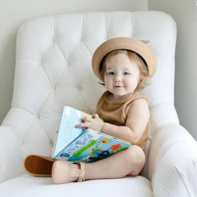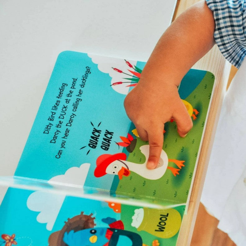 What sound does this animal make? Let's join a ditty bird and take a walk around the farm. Press the sound button on each page to listen to real-life animal sounds and ‘moo’, ‘baa’, ‘quack’ along with our favorite animal sounds song!