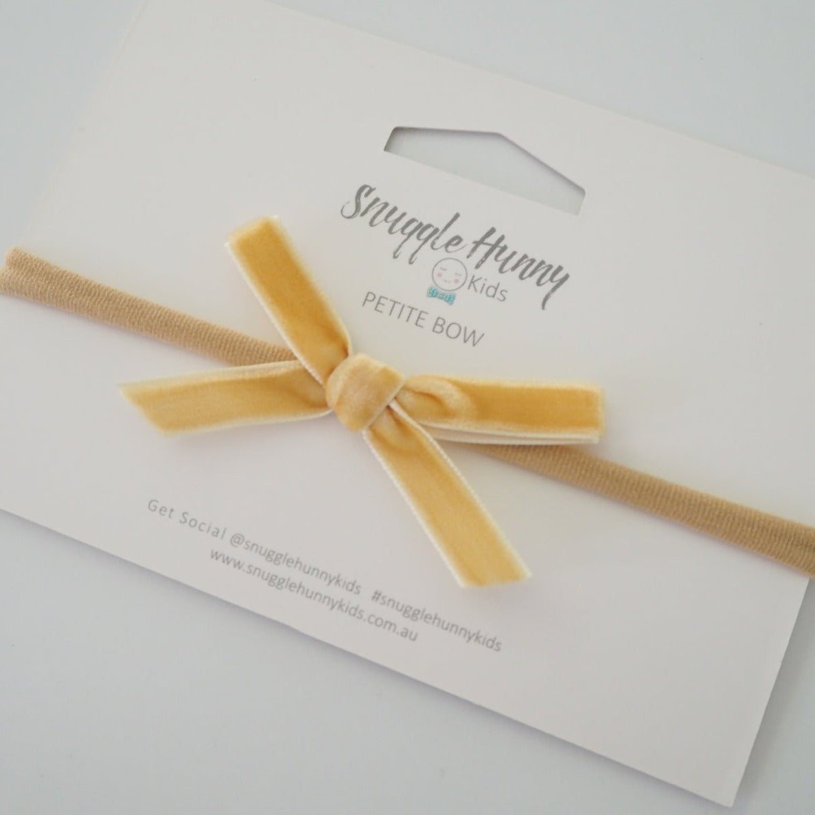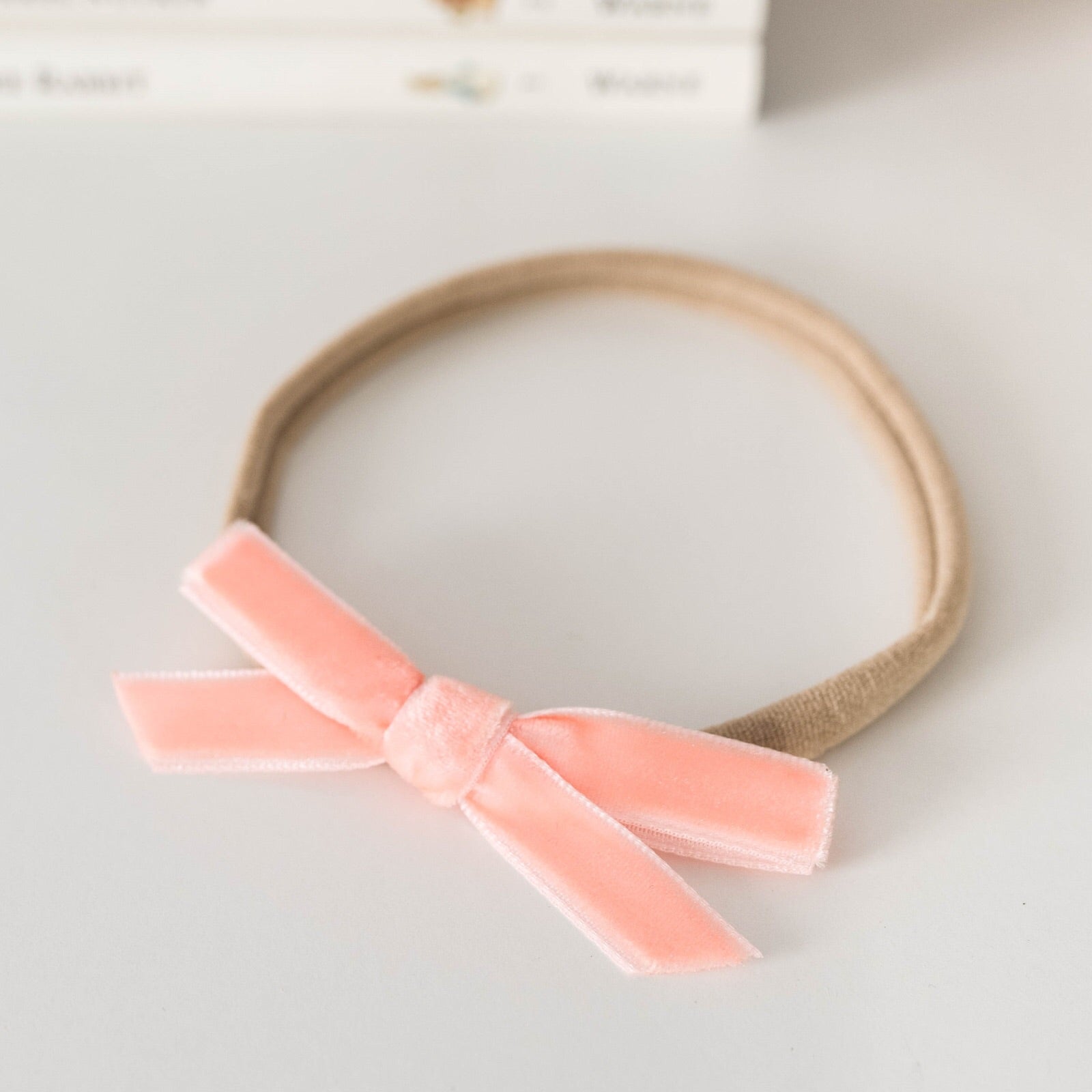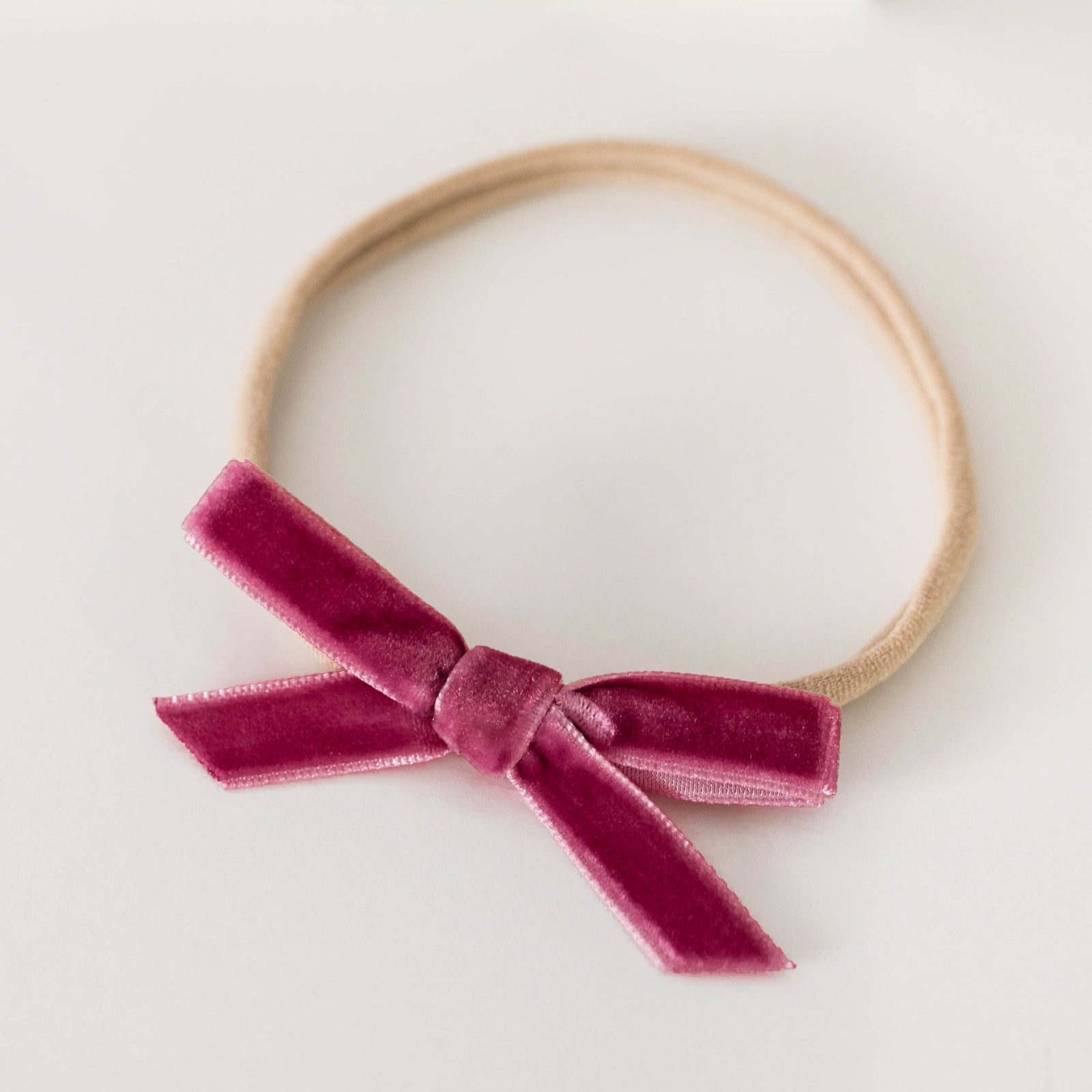 Our petite bow is made from velvet and the headband is made from soft stretch nylon elastic. Handmade. One Size Fits All.
