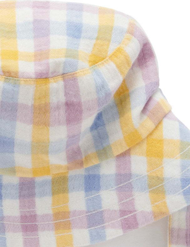 Featuring a sweet all over floral print on one side, and a classic check design on the reverse! Designed with velcro fastening under the chin to keep the hat secure. Made from 100% Organic Cotton muslin for a soft and breathable hat.