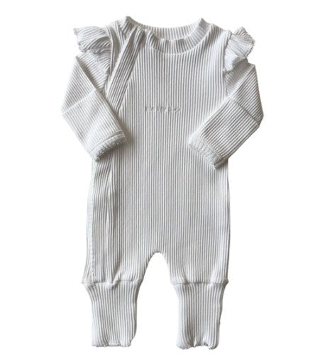 This thick embroidered ribbed cotton jumpsuit allows for ease of movement. Designed with a higher neck and windproof feet for those cooler winter months. The hidden side two-way zip allows for those easy nappy changes without your little babe getting cold.