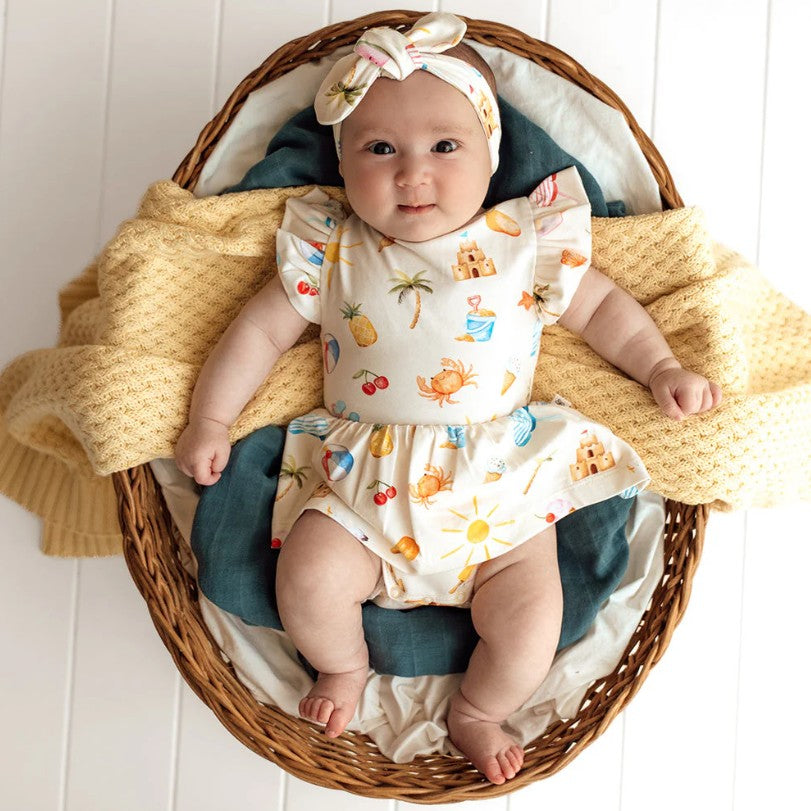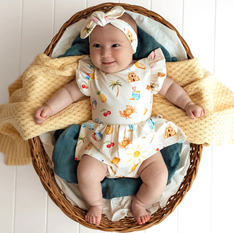 Soft and stretchy, our dresses are easy-care and very comfy for bub. The sizes up to and including size 1 come with a snap underbody to go over a nappy. Size 2 and up doesn't have the snap body feature. We have really focused on the details and ensured the dresses up to size 1 are short enough so that a baby can crawl and not trip over the skirt. Size 2 and over, when they're walking, is a bit longer.