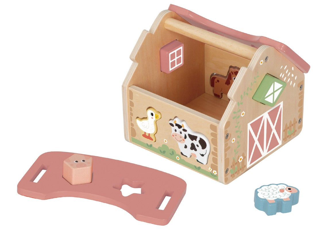 Featuring a delightful farmhouse design complete with a convenient carry handle, this shape sorter is perfect for on-the-go fun. The removable roof allows easy access to the shapes stored within, ensuring endless playtime enjoyment. Crafted from high-quality timber and plywood and painted with child-safe, non-toxic paint, parents can rest assured that safety is a top priority.